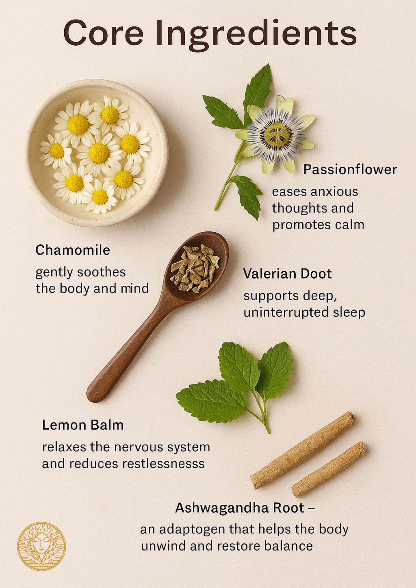 Passionflower – eases anxious thoughts and promotes calm • Valerian Root – supports deep, uninterrupted sleep