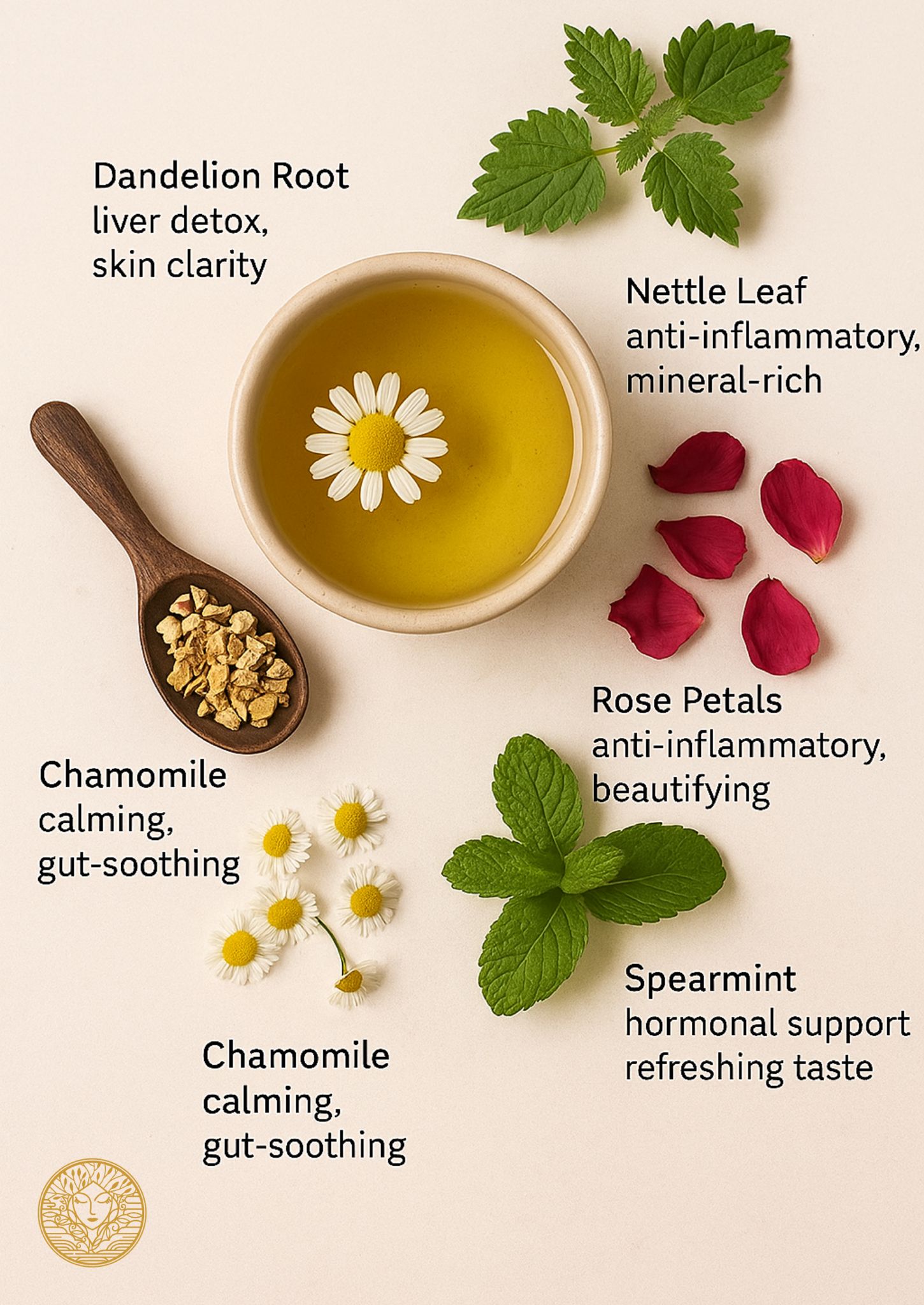 Dandelion Root – liver detox, skin clarity • Nettle Leaf – anti-inflammatory, mineral-rich